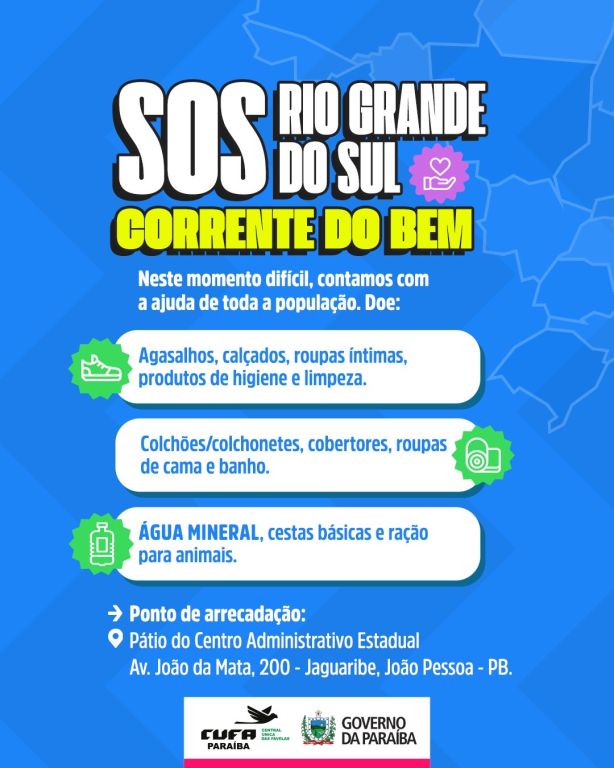O Governo da Paraíba, através da Secretaria de Estado da Administração, iniciou a arrecadação de donativos para a população do Rio Grande do Sul. A ideia da “Campanha SOS Rio Grande do Sul – Corrente do bem” é incentivar doações para as vítimas da maior enchente já registrada na região.