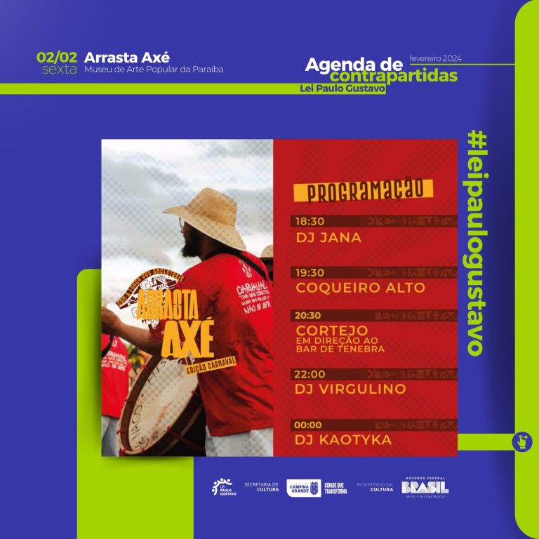 Nesta sexta-feira, 02, o “Bloco Arrasta Axé” sairá pelas ruas de Campina Grande, compondo o calendário de contrapartidas da Lei Paulo Gustavo no âmbito municipal, executado pela Prefeitura de Campina Grande, através da Secretaria de Cultura (Secult).