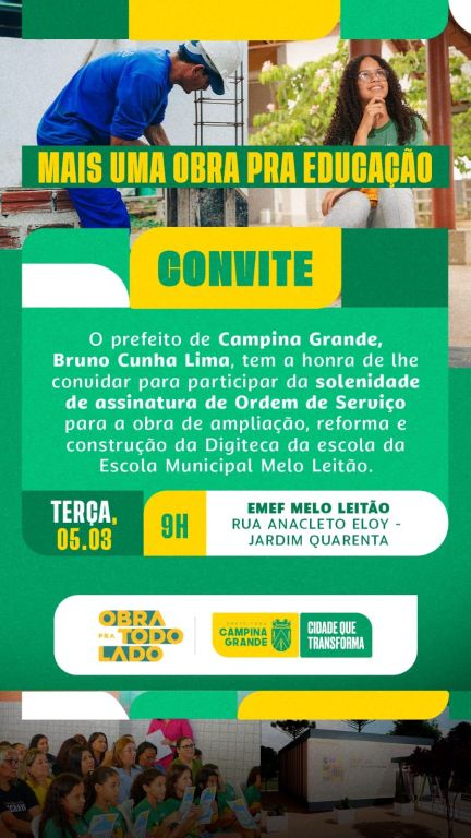 O prefeito Bruno Cunha Lima assinará na unidade a Ordem de Serviço de reforma, ampliação e construção, envolvendo uma Digiteca, oito novas salas de aula, uma nova bateria de banheiros e um playground. A cozinha da escola será ampliada e também receberão reformas as coberturas de quatro salas de aula existentes.