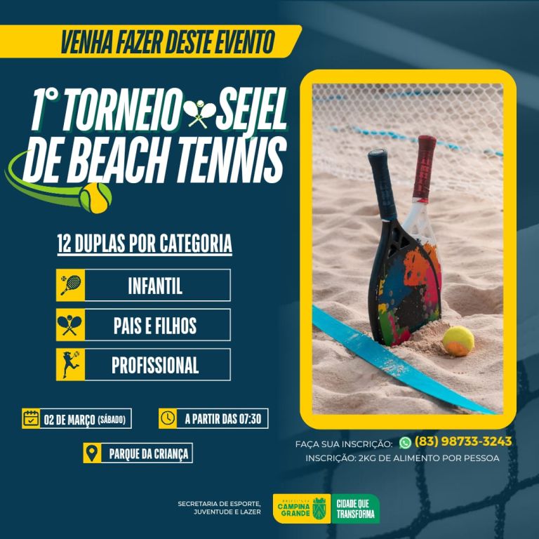 A Prefeitura de campina através da Secretaria de Esporte, Juventude e Lazer (Sejel), realiza neste sábado, 2, a partir das 7h30 o 1º Torneio Sejel de Beach Tennis, o evento será realizado no Parque da Criança e contará com 12 duplas, divididas em 3 categorias, infantil, pais e filhos e profissional.